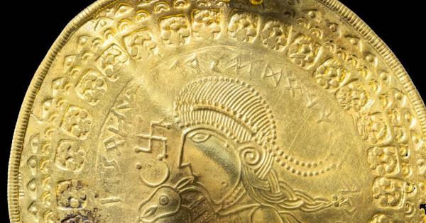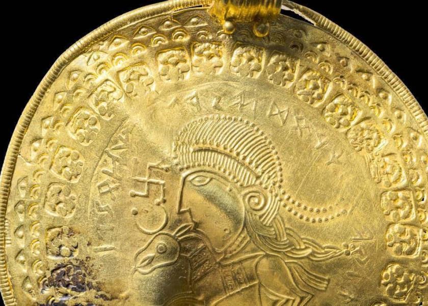 Los expertos creen que la colección se enterró hace 1.500 años, ya fuera para ocultarlo de enemigos o como tributo para apaciguar a los dioses. Una de las piezas, un bracteato dorado -un delgado colgante decorativo- muestra una inscripción que dice "él es el hombre de Odín", probablemente una alusión a un rey o señor feudal.
