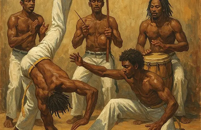 La capoeira es una práctica cultural originada por comunidades afrodescendientes en Brasil durante el periodo colonial. Se desarrolla en una rueda o círculo, donde dos participantes interactúan mediante movimientos coreografiados que simulan combate. Alrededor, otros integrantes del grupo cantan, tocan instrumentos como el berimbau y marcan el ritmo con palmas.