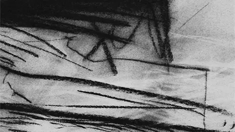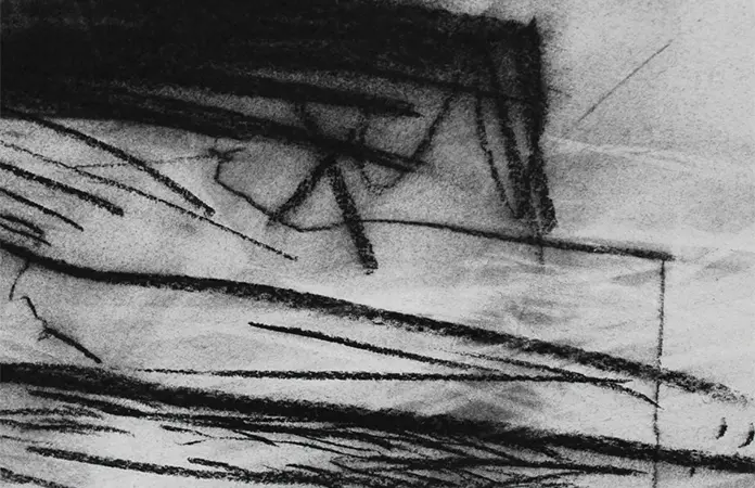 El artista trabaja con una paleta en blanco y negro como forma de limitar los recursos materiales y concentrar la exploración en el trazo, las texturas y los contrastes. Capas de carbón, polvo de carboncillo y borrados sucesivos construyen superficies con distintos matices y densidades.