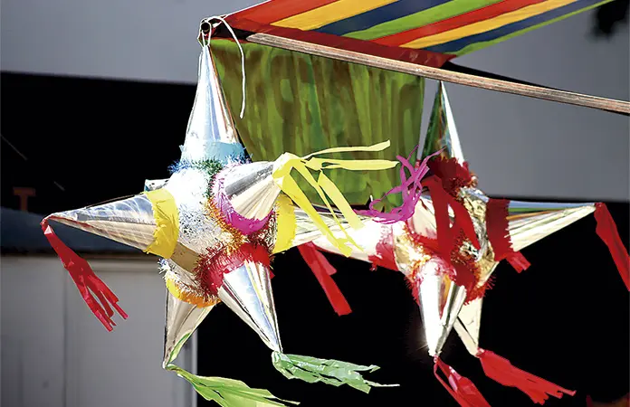 Originalmente elaborada con una olla de barro y forrada con papel de china de colores, la piñata tradicional adoptó la forma de una estrella con siete picos. Cada uno de ellos simboliza los pecados capitales, mientras que el acto de golpearla con los ojos vendados alude a la fe como guía. El palo representa la virtud que vence a las tentaciones y el contenido en su interior —frutas de temporada, cacahuates y dulces— simboliza las recompensas espirituales que se obtienen al superar el pecado.