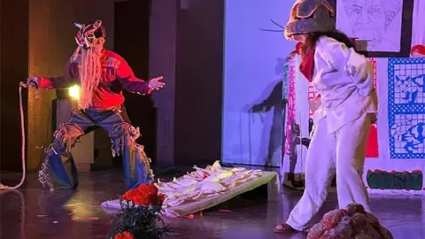 Los personajes, interpretados por artistas potosinos egresados de la Escuela Estatal de Teatro, dan vida a elementos como la flor de cempasúchil, el copal y la muerte, figuras esenciales dentro del imaginario del Día de Muertos.