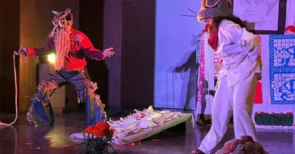 “Quena unca Xantolo” destaca por su propuesta escénica que integra teatro de sombras, títeres danzantes, música tradicional y vestuarios iluminados con luz negra, lo que genera una atmósfera simbólica y colorida.