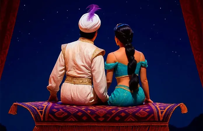 La historia de Aladdin proviene de Las mil y una noches, colección de relatos del Medio Oriente transmitidos por tradición oral. El personaje principal es un joven que vive en la calle y encuentra una lámpara mágica que le permite cambiar su destino. El genio que habita la lámpara lo acompaña en una aventura que lo enfrenta a sus deseos, su identidad y su capacidad de elección.