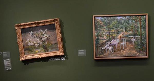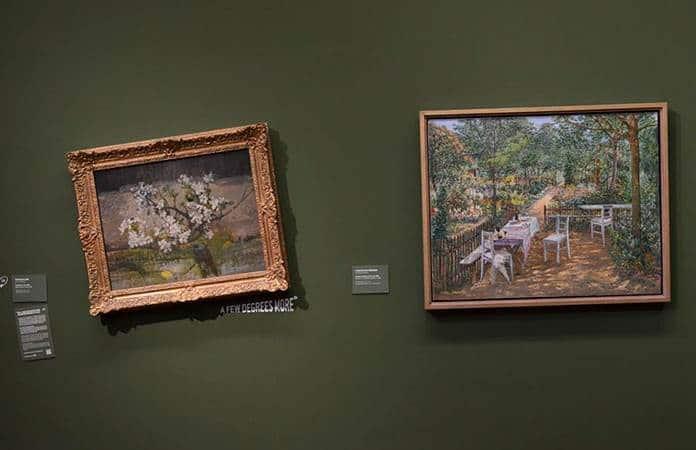 Los cuadros, principalmente paisajes, cuelgan en diagonal en ángulos de entre 1,5, y 7 grados, y los científicos explican qué cambios causaría un calentamiento de ese mismo nivel, y también qué puede hacer cada persona para evitarlo.