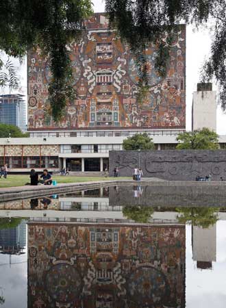 El edificio más representativo de este movimiento es la magna biblioteca central, el edificio más fotografiado de México, con un mural de motivos prehispánicos pintado con rocas naturales de colores que abarca toda la pared y que también reconoce a personalidades ilustres como Ptolomeo o Copérnico.