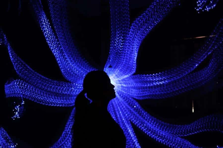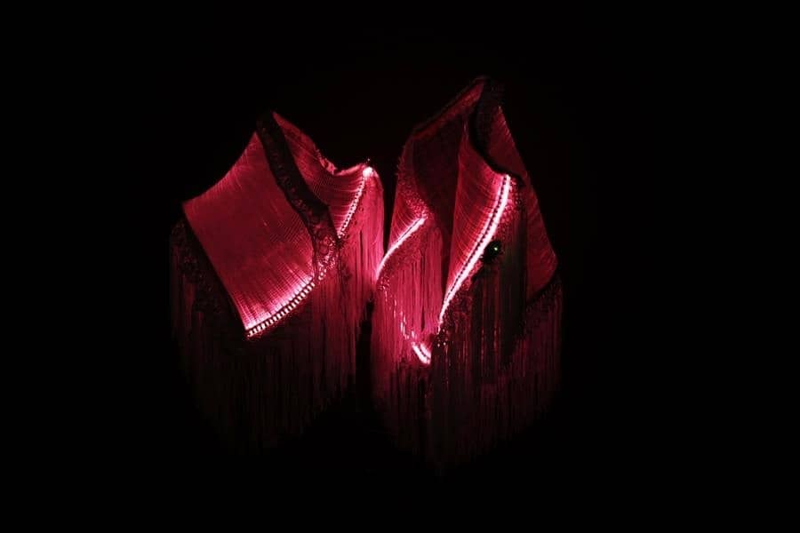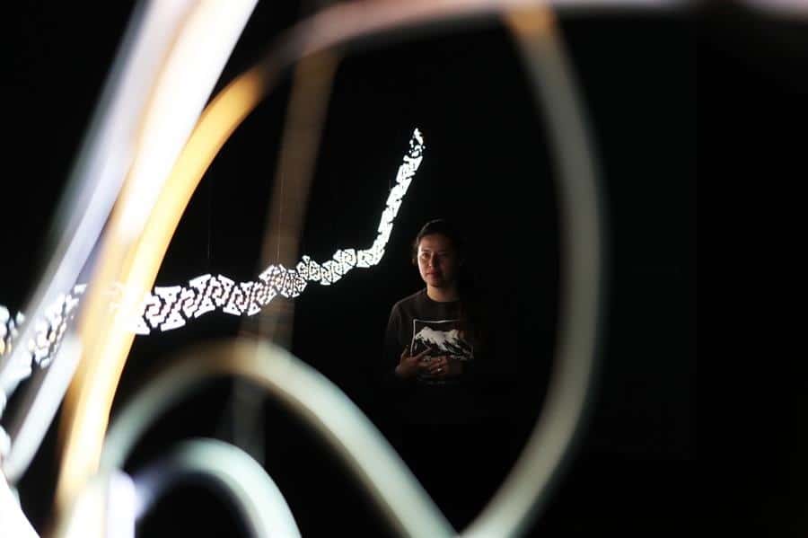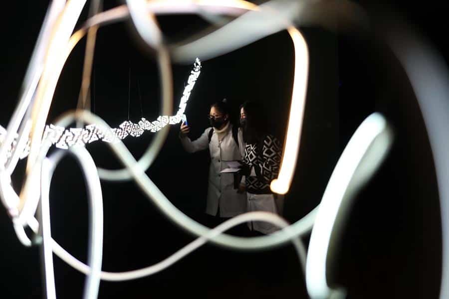 La muestra está en el Centro Cultural de España en La Paz y los visitantes ingresan a una sala oscura para observar las tres instalaciones que están hechas de materiales como luces led, fibra óptica, ropa reciclada, yute y fibras de mantas de las emblemáticas cholitas, las mujeres aimaras.