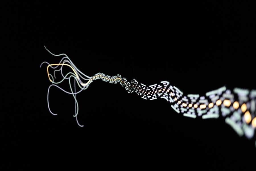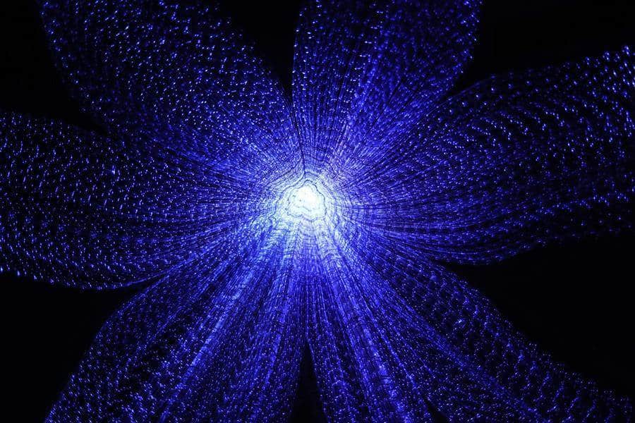 Por último presenta "Portal" una instalación de tres metros en la que teje la fibra óptica con el yute que se mezcla con el uso de luces y que muchos visitantes asemejan a una flor o a una medusa.