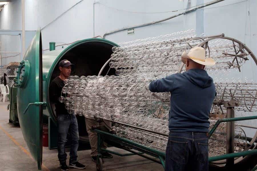 Como segundo paso, las esferas transparentes pasan a la metalizadora que es el único proceso que se realiza con una máquina, ya que las piezas son bañadas con tungsteno y aluminio, lo que hace que tengan un terminado tipo espejo, que ayuda como base para ser pintadas y decoradas.