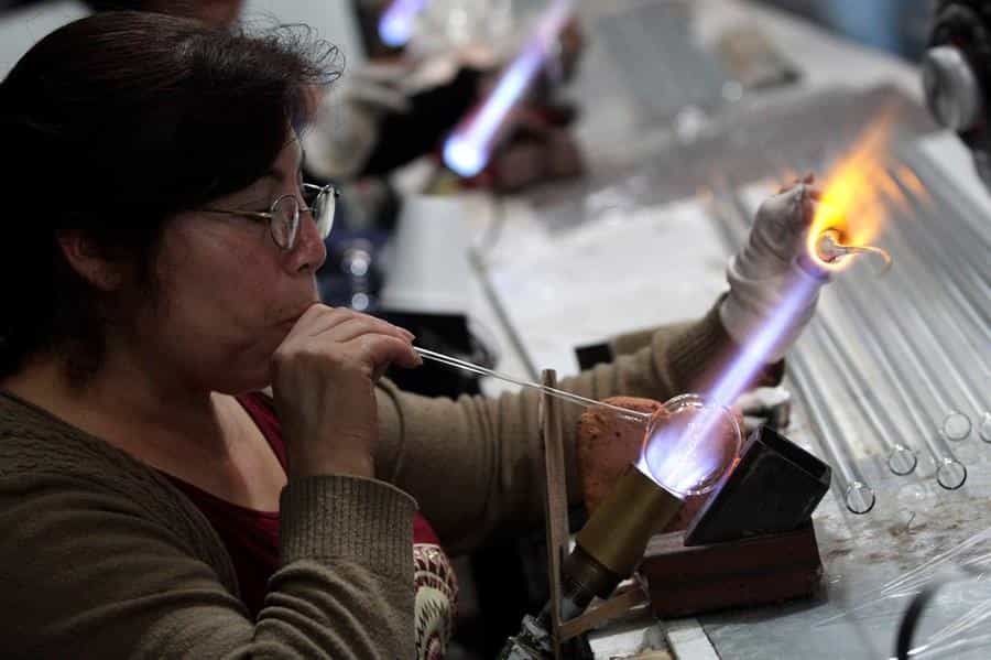 Todo comienza con la parte más complicada, donde los artesanos muestran su habilidad de manipular estas varillas de vidrio especial, también es usado para la cristalería de los laboratorios químicos.