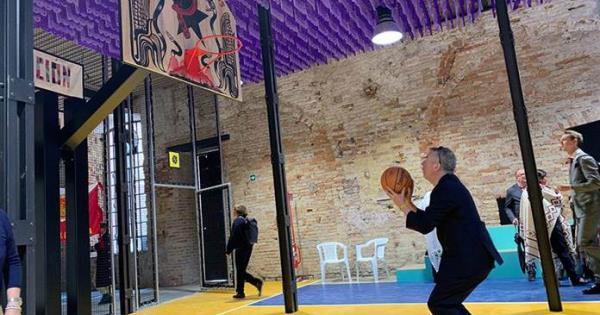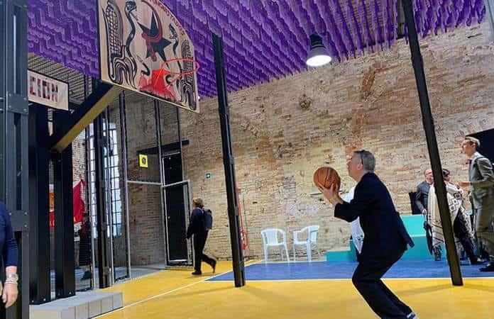 El pabellón, situado en el Arsenal veneciano, lleva por título "Infraestructura utópica: la cancha de básquetbol campesina" y en su interior se invita al visitante a tomar la pelota y hacer algunos lanzamientos, mientras suena música y la gente charla o baila.