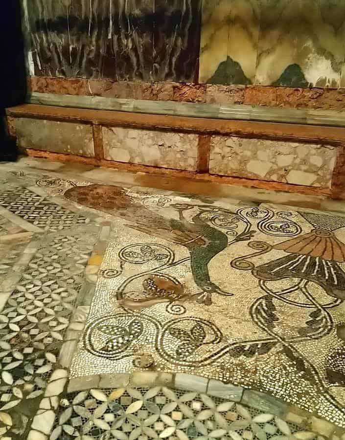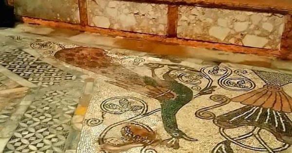 Otro mosaico perjudicado, situado en el centro de la basílica y que representa motivos vegetales, ha tenido que ser cubierto para protegerlo del paso de los turistas, que ya han vuelto a visitar el lugar.