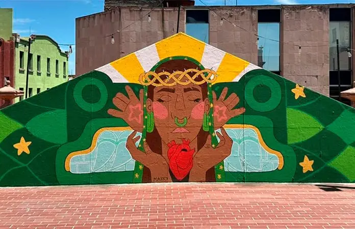 Espina materna, es el mural de la artista potosina María José Torres Medina, conocida artísticamente como Mako Torres, propone una reinterpretación visual y simbólica de la maternidad a partir del encuentro entre la Virgen de Guadalupe y Coatlicue.