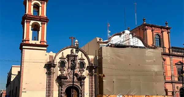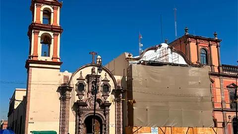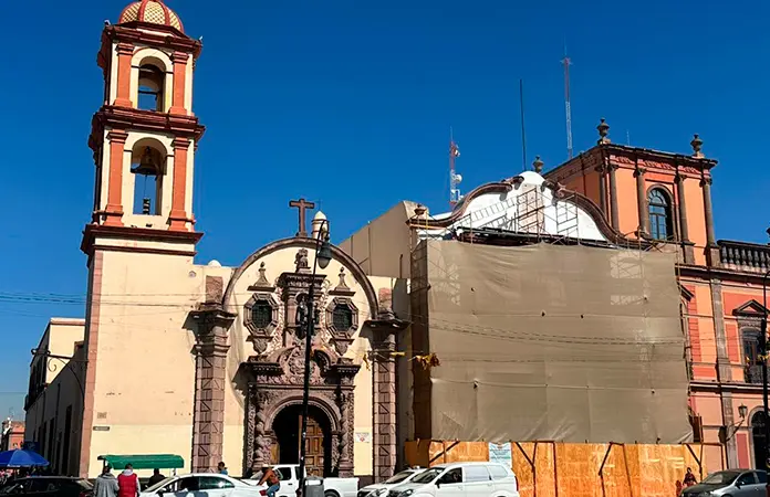 La restauración de la fachada del Templo de la Compañía, sede de la Parroquia del Sagrario, se encuentra en proceso como parte de un proyecto de conservación patrimonial en el Centro Histórico de San Luis Potosí, frente a la Plaza de Fundadores.