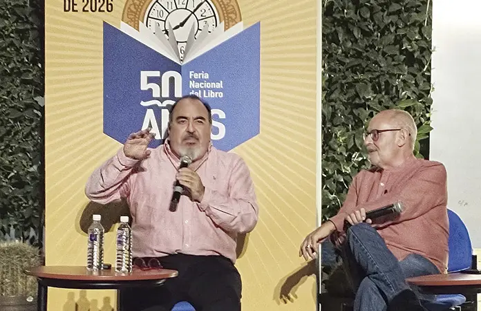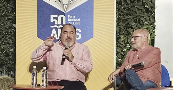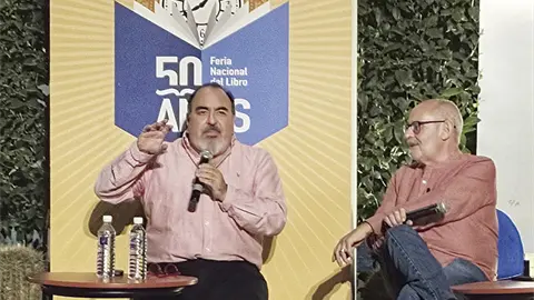 La charla "Viaje de papel" reunió a Benito Taibo y Alejandro Rosas en la 50 Feria Nacional del Libro (FNL) de la Universidad Autónoma de San Luis Potosí, donde compartieron con el público un recorrido por su formación como lectores y escritores.
