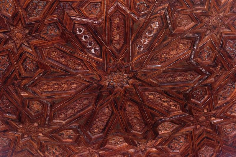 El techo del templete ya restaurado une 669 zafates, piezas de madera alargadas que se organizan geométricamente en ruedas con estrellas para diseñar una decoración centrada en un octógono con componentes tallados y policromados de forma minuciosa.