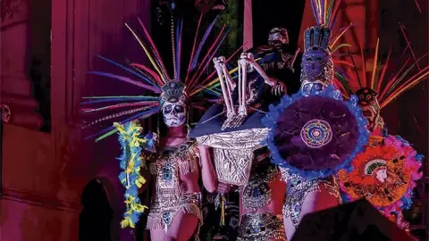 El espectáculo toma su nombre del tzompantli, estructura ritual donde los pueblos mesoamericanos colocaban los cráneos de guerreros caídos como símbolo de trascendencia. Desde esa visión ancestral, la puesta en escena recorre distintos momentos históricos: la cosmovisión indígena, el sincretismo religioso de la Colonia, la reivindicación de la muerte en la Revolución y la visión moderna que, entre fiesta y negación, mantiene viva esta tradición.
