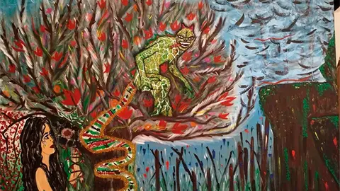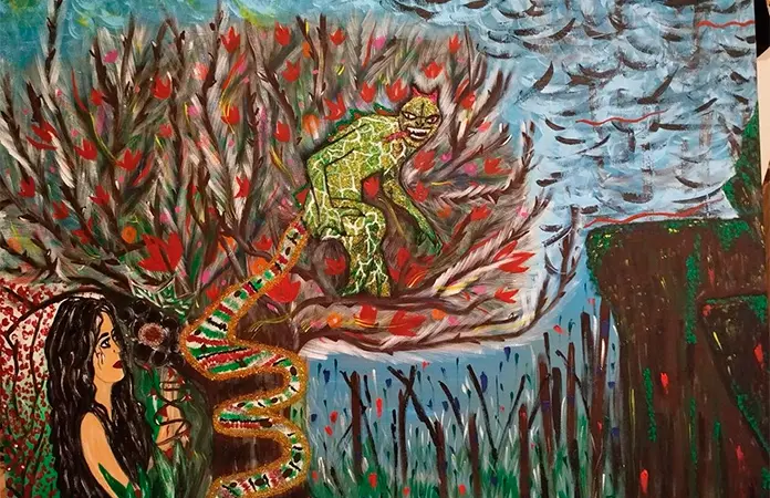 El proceso creativo de la artista parte de vivencias personales y cambios de etapa, lo que se refleja incluso en la manera de firmar su obra. Tras trabajar durante años bajo su nombre, adoptó la firma Gato Cristiano, identidad que dialoga con la serie que ahora presenta. En piezas como Mi Edén, la autora revisa episodios simbólicos desde una postura crítica y actual.
