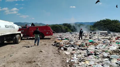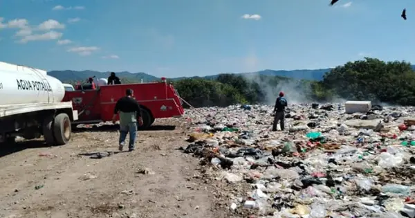 CIUDAD VALLES.- Prenden fuego al basurero intermunicipal ubicado en Tancanhuitz, apoyaron bomberos de Axtla en las labores para apagar el fuego. Ayer por la mañana, temprano hubo una notificación de usuarios de redes sociales sobre salida de humo de las dunas de desechos del confinamiento al que cinco municipios mandan sus desechos y que podría estar recibiendo alrededor de 150 toneladas diarias de desechos.