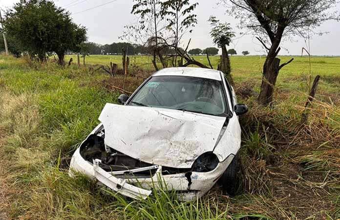 Un vehículo Dodge Neón blanco, modelo antiguo, se salió del camino y chocó de frente contra un árbol; la unidad quedó destrozada del frente, y sus tres ocupantes resultaron heridos.