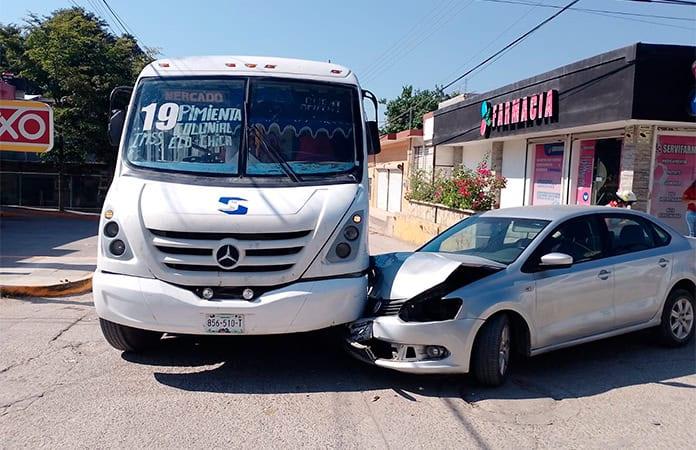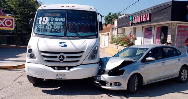 CIUDAD VALLES.- La conductora de un vehículo no tuvo precaución al transitar por la colonia 20 de Noviembre y chocó contra un autobús urbano; en el percance una pasajera resultó lesionada.