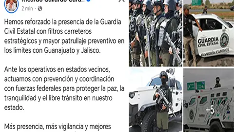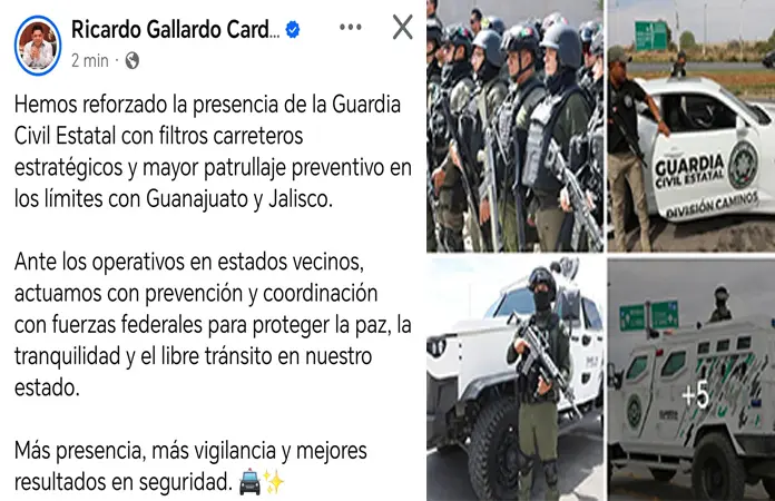 CIUDAD VALLES. -La muerte de Nemesio Oseguera Cervantes "El Mencho", en el municipio de Tapalpa, Jalisco, a manos del Ejército Mexicano provoca bloqueos, toma de centrales aéreas y reacciones violentas en varios estados de la República mexicana y ante eso, el Gobernador Ricardo Gallardo Cardona anunció reforzamiento de las fronteras de la entidad con Guanajuato y Jalisco.
