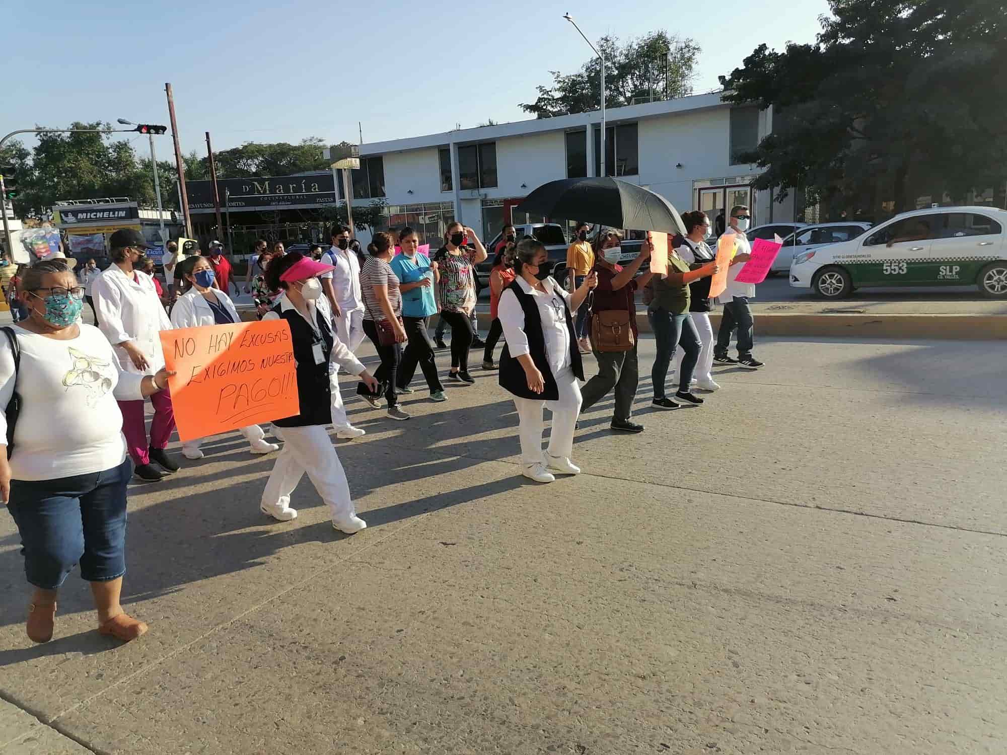 CIUDAD VALLES. Alrededor de 50 trabajadores de la Secretaría de Salud bloquearon este día los cinco carriles de la Glorieta Hidalgo porque no les han pagado sus vales de despensa que les debieron haber enviado desde el 16 de diciembre.