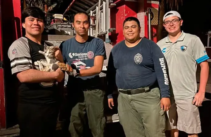 Los bomberos recibieron una llamada de auxilio, pedían apoyo para rescatar un gato atorado en una palma con espinas de 8 metros, el animal se encontraba en la punta del árbol y no podía bajarse, por lo que los bomberos acudieron a rescatar al felino y lograron bajarlo del árbol para entregárselo a la familia propietaria de la mascota.