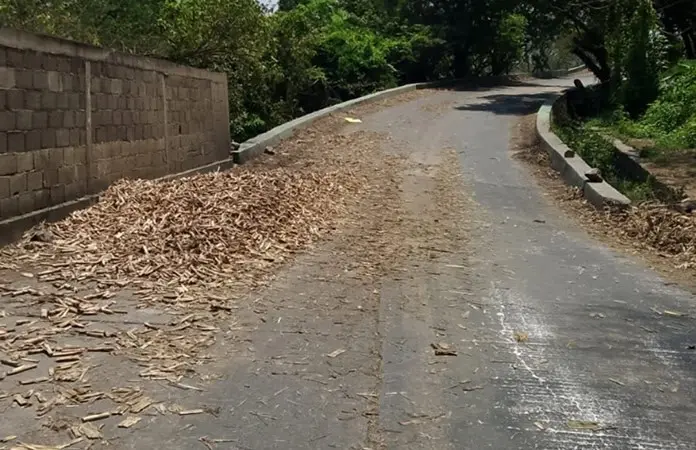 CIUDAD VALLES.- Derraman caña picada en la carretera a El Naranjo y ninguna autoridad previno, a pesar del riesgo que causan esos obstáculos en una zona con barranco, que pueden generar un accidente de fatales consecuencias.