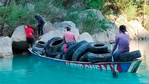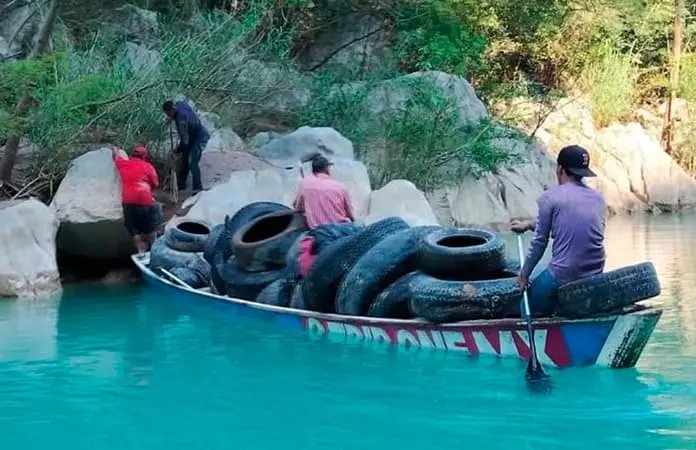 Un grupo de lancheros hicieron la recolección de hasta 40 neumáticos arrojados al río Santa María, que es el afluente que precede al Tampaón y que corre desde el estado de Guanajuato.