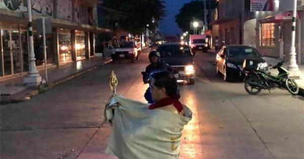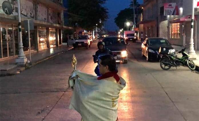 Acompañado de una campana que avisaba sobre su recorrido, Juárez Villeda acercó la cruz del Santísimo Sacramento a los ciudadanos que andaban a pie o en carro la noche del lunes, como una muestra de acercar la iglesia a los feligreses y para que no tuvieran miedo ante el Covid-19, razón que les impide ir al templo.