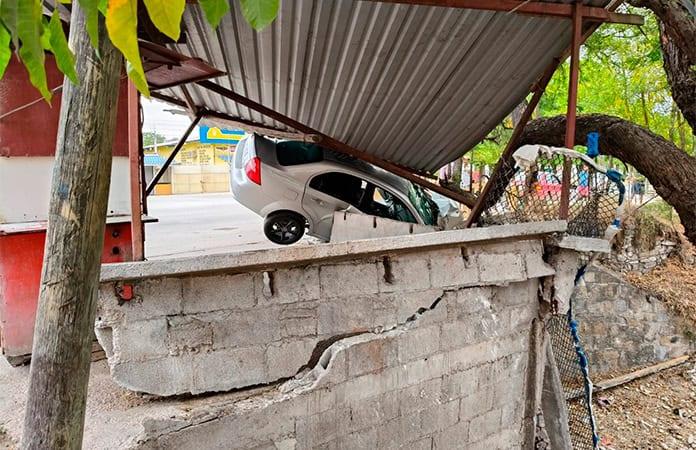 CIUDAD VALLES.- Un joven conductor estuvo a punto de caer a un arroyo seco tras chocar su vehículo contra el muro de contención del puente de la colonia Méndez.