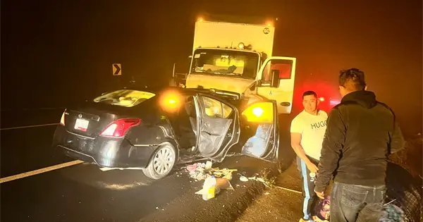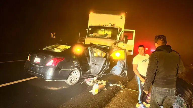 El percance ocurrió a la altura del kilómetro 11, cerca de la localidad de Vicente Guerrero, en el municipio de Rayón, donde un camión de una abarrotera se impactó de frente contra un automóvil Nissan Versa negro con placas de Tamaulipas.