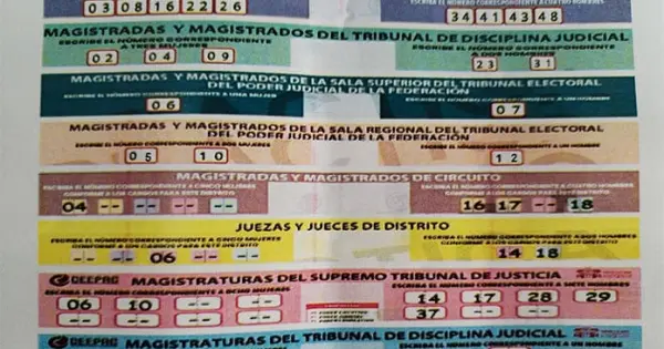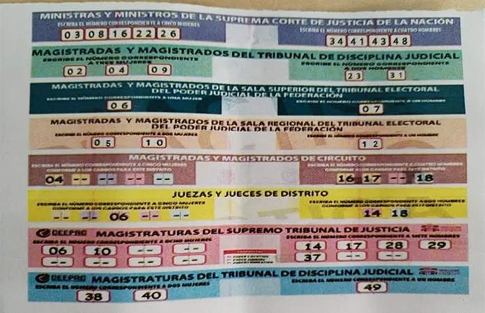 Un ciudadano dijo que la noche de este martes 27 de mayo encontró una pequeña columna de hojas en el cajero de Banco Santander, en donde vienen resumidas a renglones los colores de las boletas que le darán en la elección judicial a los ciudadanos, aunque con números ya sugeridos en las casillas de votación.