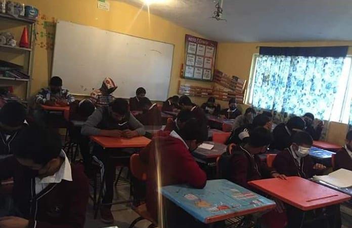 Refiere que un maestro atiende primero y segundo grado con 25 alumnos y ella el tercer grado con 10 estudiantes, aquí no existe la sana distancia sino que los estudiantes están juntos, incluso los maestros no tienen espacio para revisar el trabajo de los estudiantes.