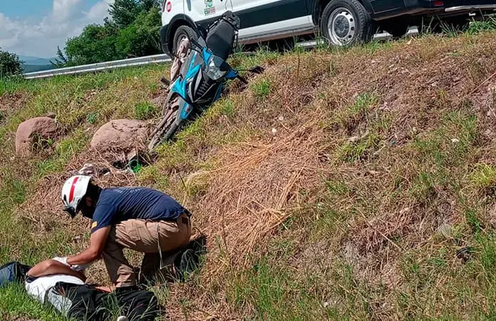 Ciudad Fernández.- Continúan los accidentes de motociclistas, ahora un joven derrapó con su unidad motriz y terminó en el Canal de la Media Luna, sufriendo varias lesiones.