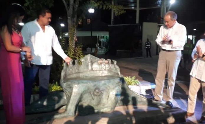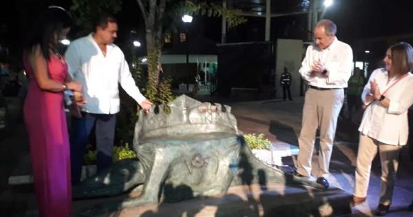 XILITLA. La noche de este miércoles, el gobernador Juan Manuel Carreras en compañía de su esposa y del alcalde realizó la revelación de la escultura “banca cocodrilo", la cual se encuentra en una esquina de la plaza.
