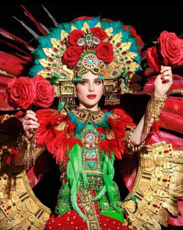 La ganadora desfiló con su traje típico nacional, inspirado en la diosa Xochiquétzal, diosa de la belleza, precisamente en la mitología azteca y que en náhuatl quiere decir "flor preciosa".