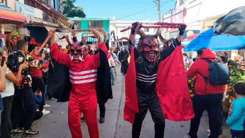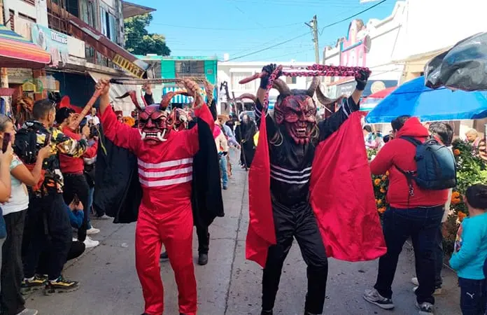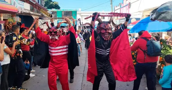 Dentro de las celebraciones de esta mañana, una de las comparsas más competitivas de Valles fue al centro a bailar ante las cámaras de los transeúntes y autoridades que recién habían hecho el ritual de las ofrendas, organizado por el comercio ambulante de Valles, dando un adelanto de lo que se toparán en las próximas contiendas de esta categoría, en los terrenos de la feria en días santos.