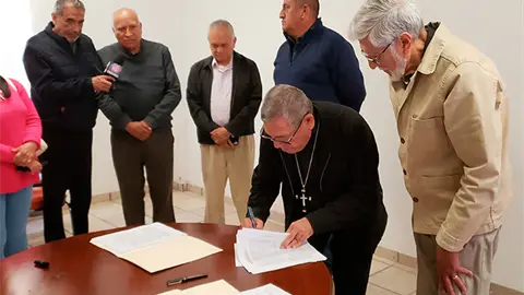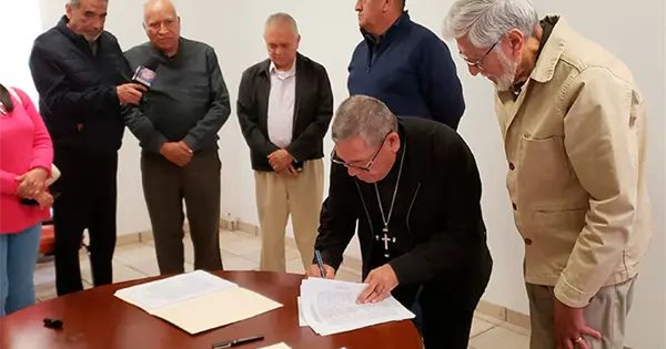 Matehuala.- El obispo Margarito Salazar Cárdenas antes de dejar la Diócesis de Matehuala firmó uno de los documentos más importantes: la entrega de la Diócesis para quien será el administrador diocesano o para el IV obispo que vaya a llegar a Matehuala. Hasta el momento no se ha nombrado su sucesor ni un administrador episcopal.