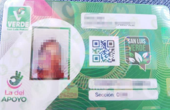 Justo arriba del sello, está el logo del Partido Verde y abajo la inscripción “San Luis Potosí” y a un lado de esto, la foto de la beneficiaria y sus datos, así como el seccional electoral al que pertenece.
