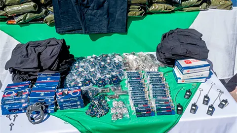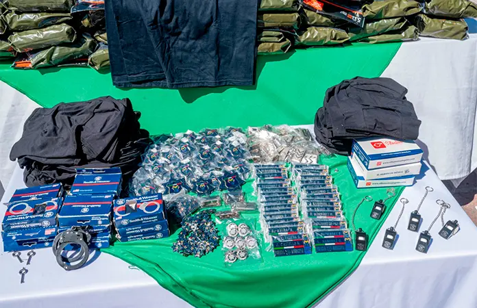 Además se les entregó fornituras, silbato policial, esposas, casco balístico y de policarbonato, chaleco balístico, escudo antimotín, bastón retráctil y lámpara de mano.