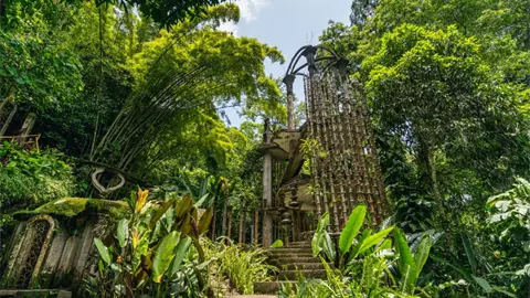 "Entre cascadas, pozas naturales y senderos rodeados de vegetación, emergen más de treinta estructuras surrealistas en concreto que parecen surgir de la selva misma: escaleras que no conducen a ningún lugar, puertas abiertas al cielo y columnas orgánicas que se integran al entorno como si siempre hubieran pertenecido a él".
