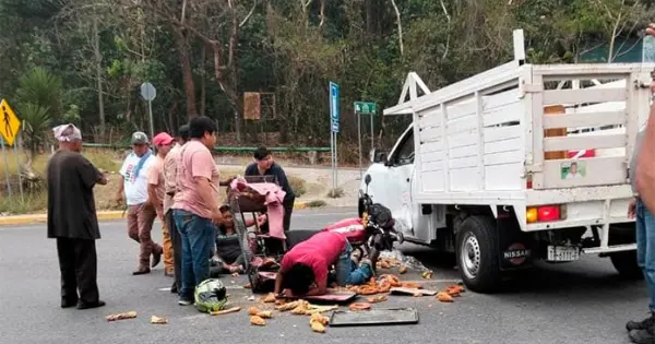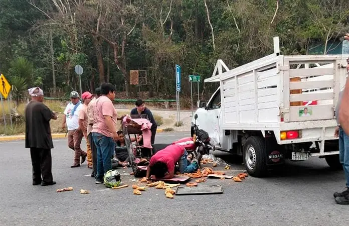 TANCANHUITZ.- Cerca del crucero de Xolol en el municipio de Tancanhuitz, un repartidor de pan que andaba en moto, acompañado de una mujer, chocó contra una camioneta que se atravesó a su paso.