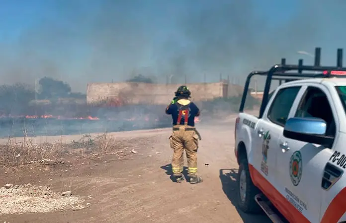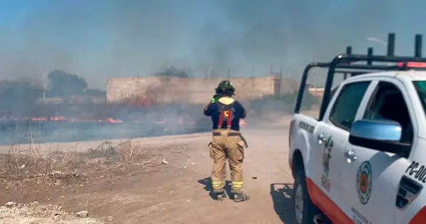 Ciudad Fernández.- Incendio de pastizal a punto de llegar a viviendas de la colonia Gama el cual fue controlado por parte de los Bomberos y elementos de Protección Civil.