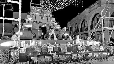 El altar es el más grande de todo el Altiplano se colocaron velas, flor de cempasúchil, aserrín, unos catrines, comida, fruta entre muchas otras cosas que se colocan en los altares de muertos.
