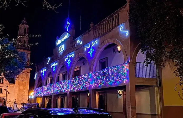 También la Presidencia Municipal ha sido decorada con luces y adornos navideños toda la iluminación apenas empieza a oscurecer y se encienden, han colocado luces de colores.