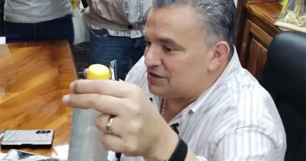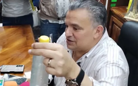 CIUDAD VALLES.- David Medina mandó llenar una botella con el agua del lavabo que hay en el privado de Presidencia, para demostrar que el agua del centro no cuenta con mucha turbiedad.