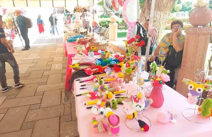 Frente al Palacio Municipal se instaló el mercadito, donde participan mujeres que elaboran desde bisutería, canastos, maceteros y flores, que ofrecen a buenos precios y que son productos de buena calidad.