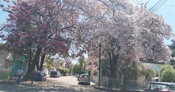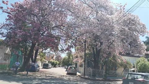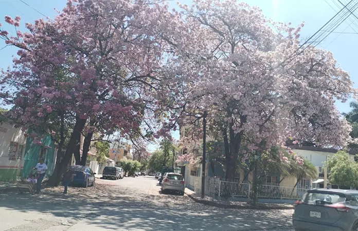 CIUDAD VALLES.- El milagro visual de primavera ocupa jardines y patios de varias viviendas y calles de Valles desde hace días: el palo de rosa que vuelve elegante cada rincón de la ciudad.