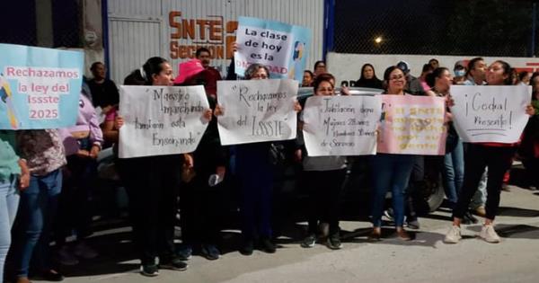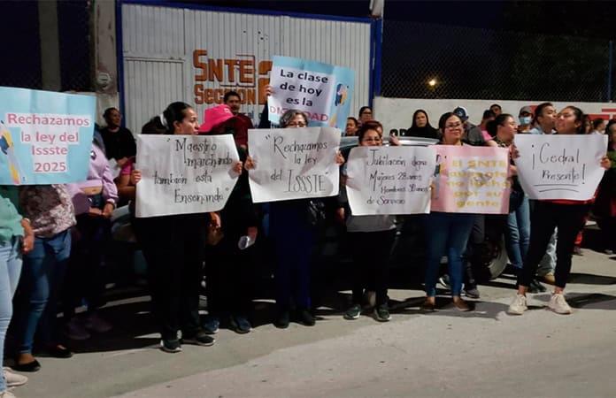 Matehuala.- Maestros de Matehuala y otros municipios del Altiplano realizaron una manifestación en contra de la nueva reforma a la Ley del ISSSTE, promovida por la presidenta Claudia Sheinbaum, ya que dicen los docentes solos perjudica, sobre todo en lo laboral.
